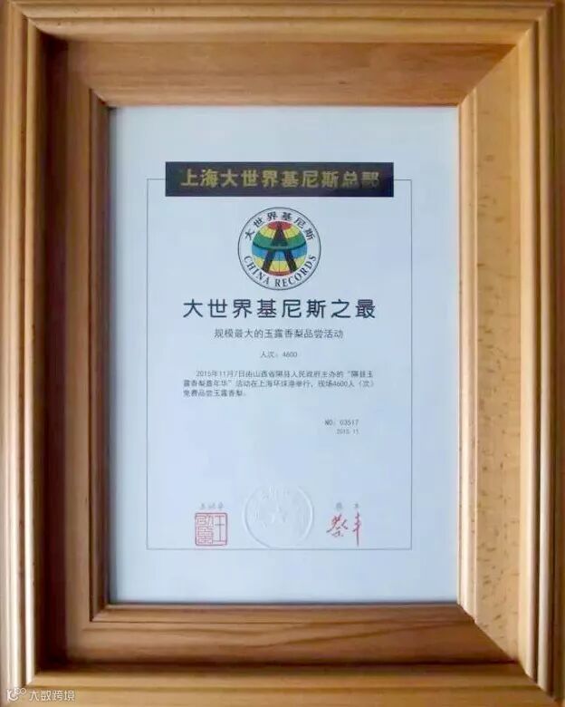 2015年,全国水果市场低迷,但山西省隰县的玉露香梨却从最初的地头价每斤3.2元飙升到8元一斤。在由山西省隰县人民政府主办的“隰县玉露香梨嘉年华”活动中,现场4600人(次)扫描、品尝贴有二维码的隰县玉露香梨。这是中国乃至世界规模最大的一次玉露香梨品尝活动,这次活动被成功载入上海大世界基尼斯之最纪录。