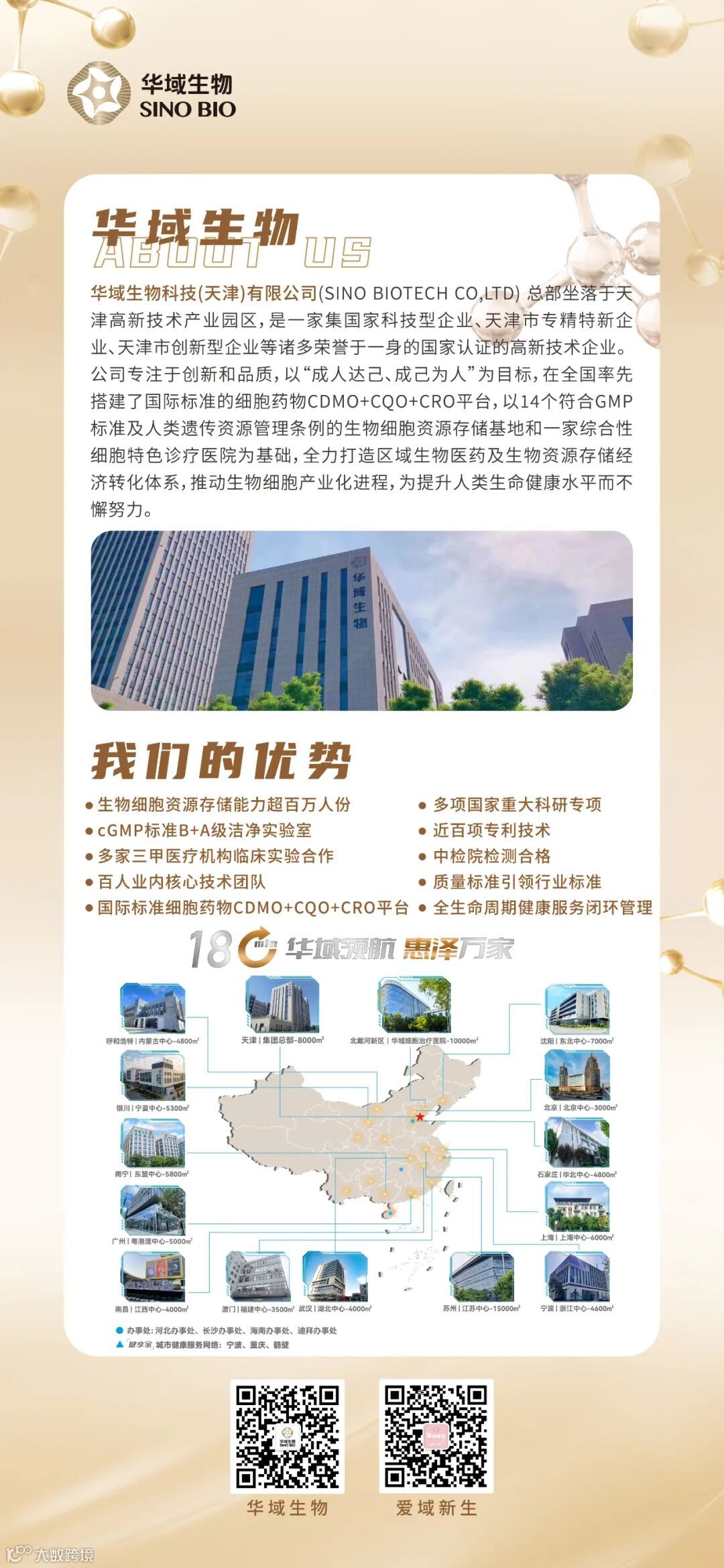 华域生物科技(天津)有限公司致力于生物资源存储、制备以及核心抗体等原辅料的研发与生产;健康管理平台等领域。