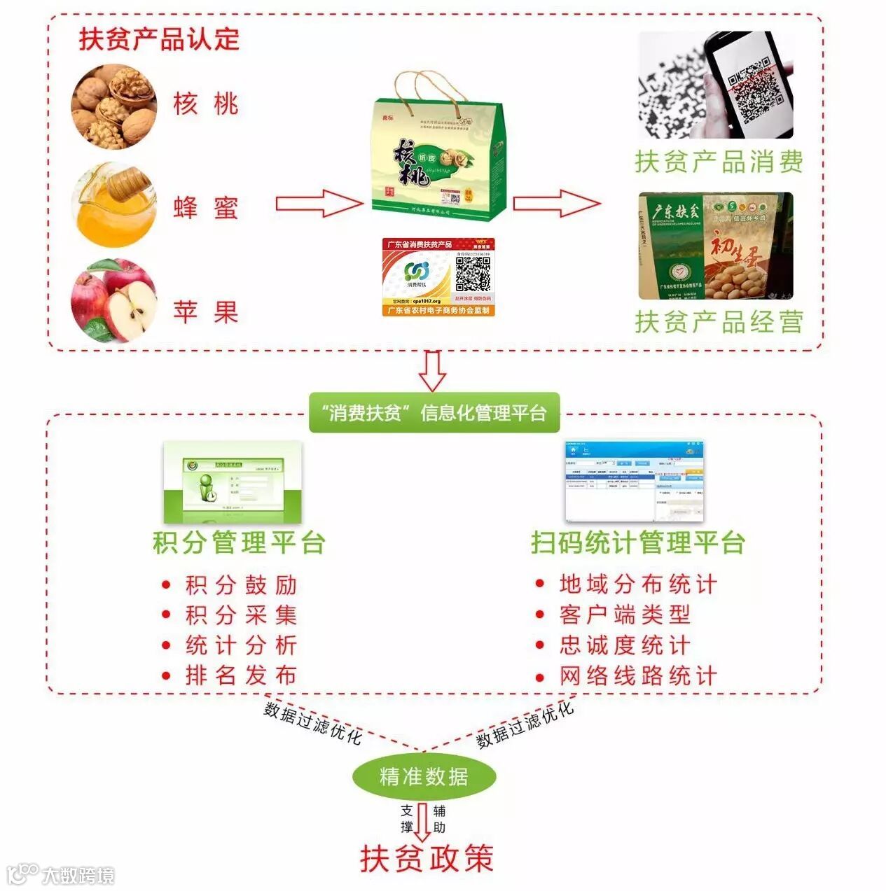 将指定产品贴上“中国消费扶贫专用标识”,对产品进行防伪追溯、积分管理等大数据信息化管理。