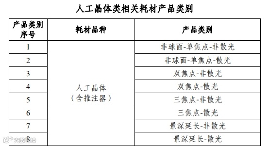 (1)人工晶体类相关耗材:获得中华人民共和国医疗器械注册证的人工晶体耗材(不包括硬性人工晶体、有晶体眼人工晶体,下同)、粘弹剂。人工晶体耗材须包含可与其配套使用的推注器。