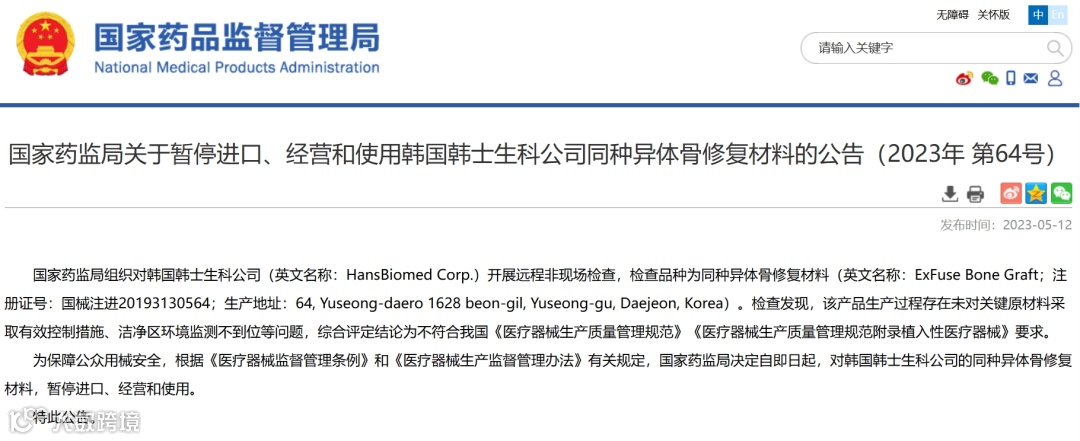 根据远程检查结果,国家药监局于2023年5月11日发布公告(2023年第64号),暂停进口、经营和使用韩国韩士生科公司(英文名称:HansBiomed Corp.)同种异体骨修复材料(英文名称:ExFuse Bone Graft;注册证号:国械注进20193130564)。