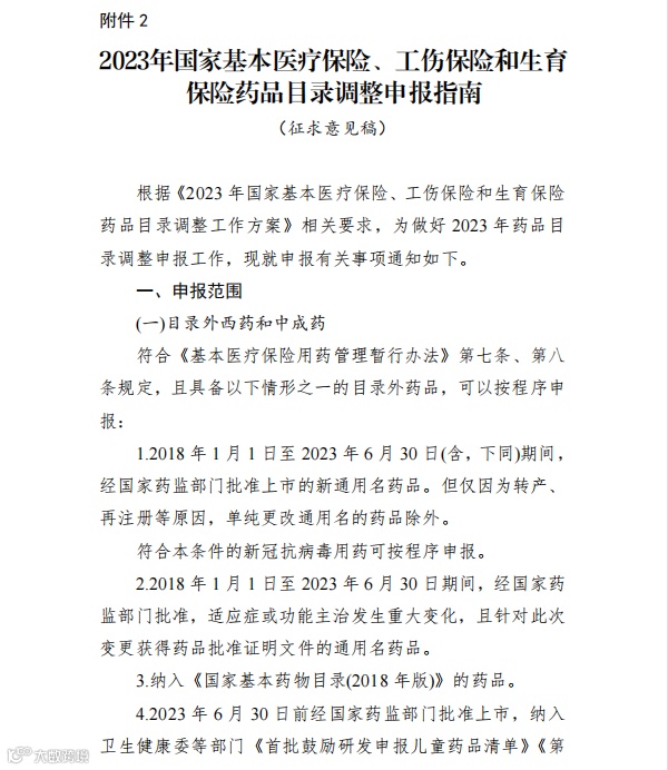 2.2023年国家基本医疗保险、工伤保险和生育保险药品目录调整申报指南(征求意见稿)