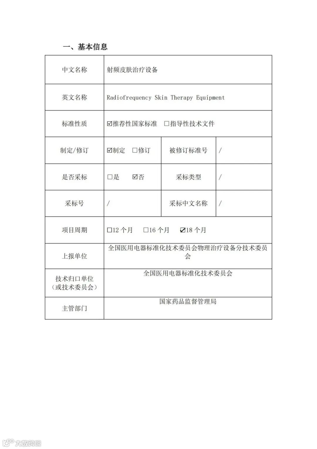 根据《医疗器械标准管理办法》《医疗器械标准制修订工作管理规范》的要求,全国医用电器标准化技术委员会物理治疗设备分技术委员会对《射频皮肤治疗设备》医疗器械国家标准立项申请项目公开征求意见,详情如下: