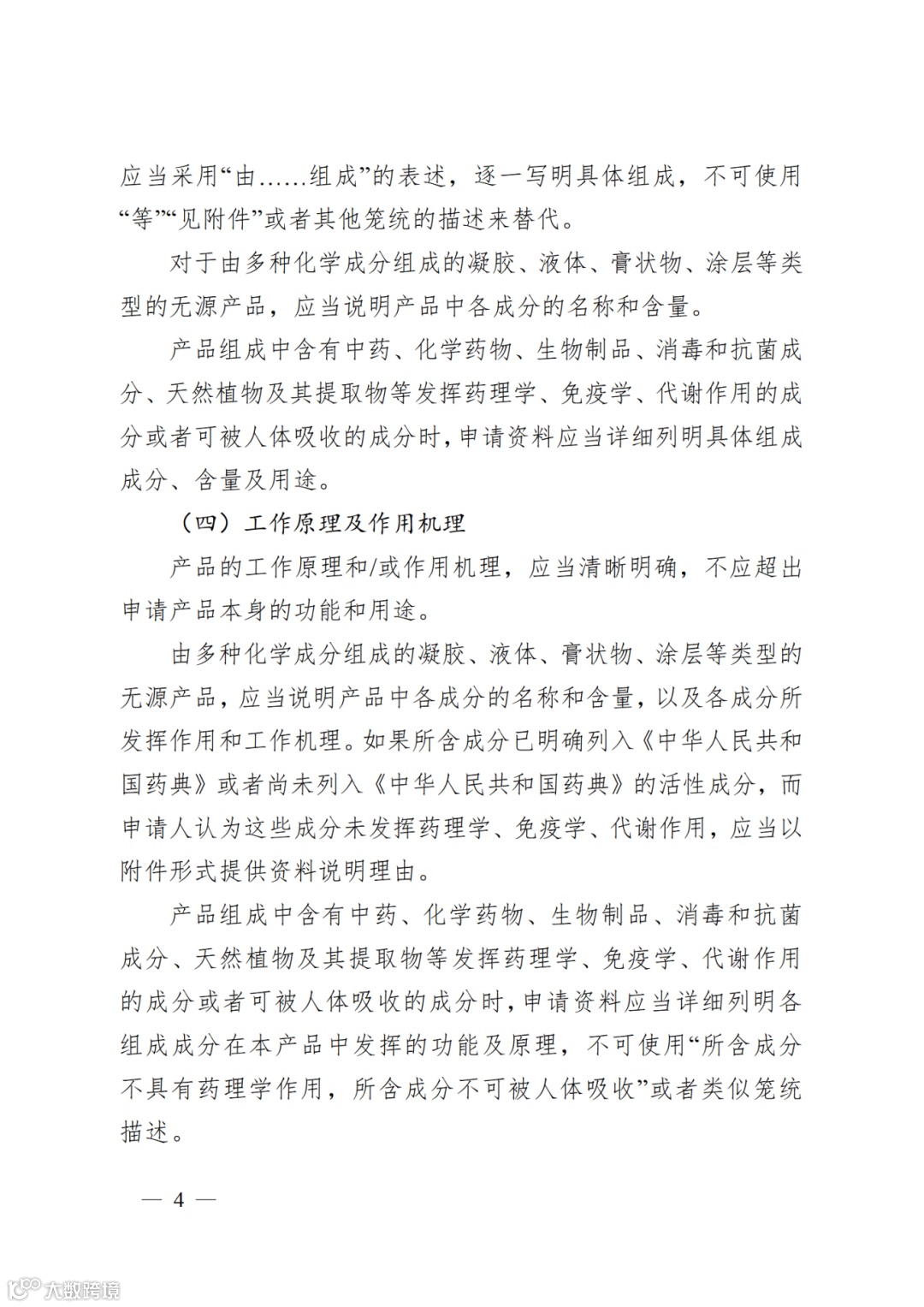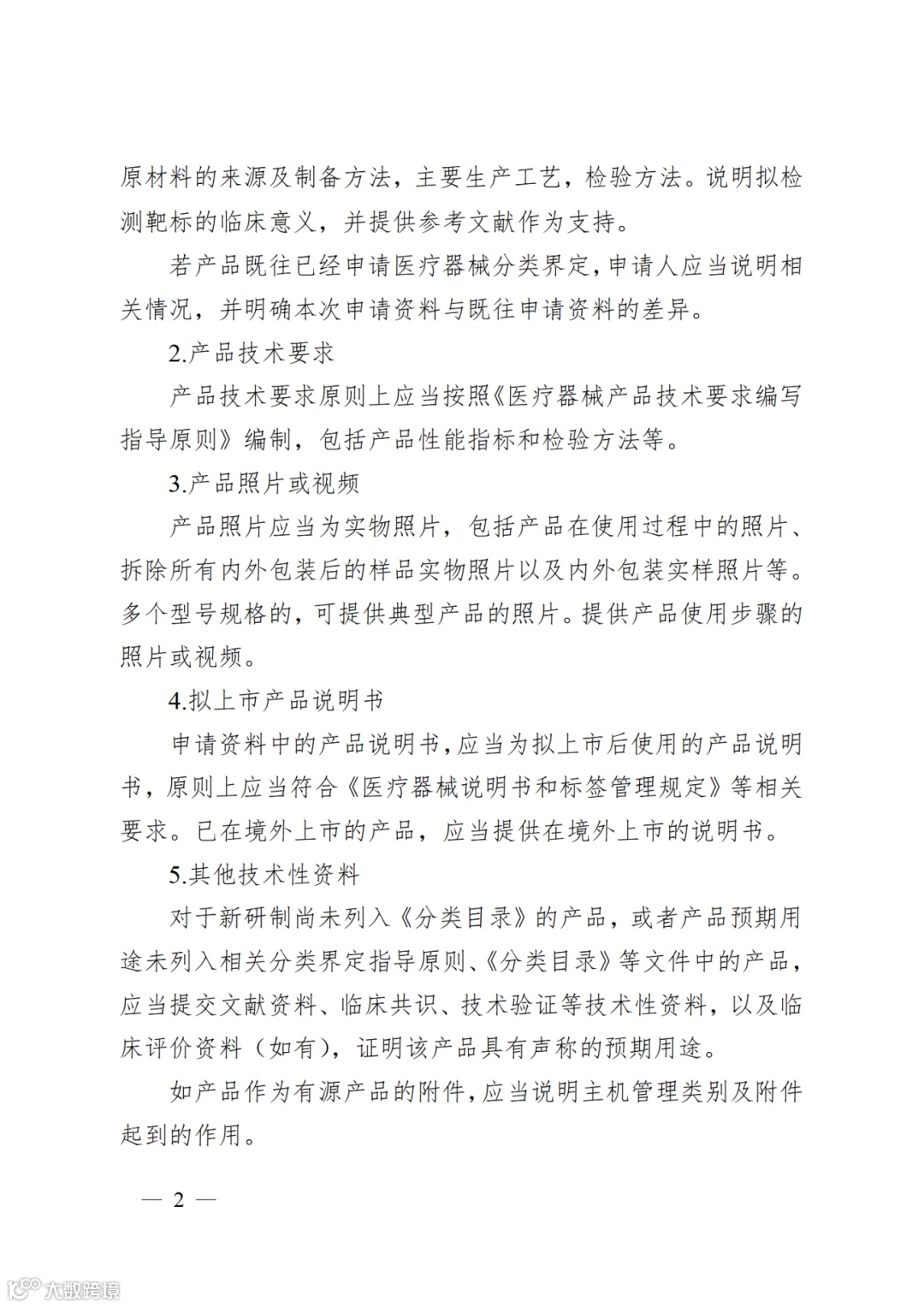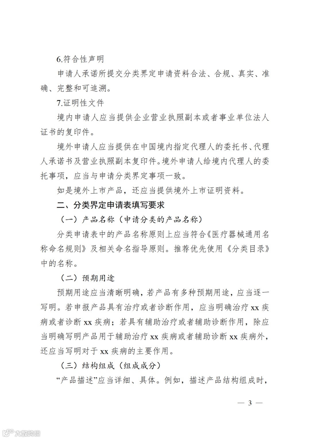 (三)规范分类界定申请资料要求。一是取消分类界定申请纸质资料要求。实现医疗器械分类界定申请网上受理、办理和告知的全程电子化。二是细化分类界定申请资料要求。进一步明确分类界定申请资料应包含的产品技术要求、拟上市产品说明书、产品照片或视频、符合性声明、证明性文件等资料的提交要求。三是完善《医疗器械分类界定申请表》填报要求。总结日常分类界定工作中的常见问题,归纳各类产品技术特点和分类界定审核要点,对《医疗器械分类界定申请表》中的预期用途、结构组成、工作原理、使用状态、材料特征、产品风险点、境内外同类产品情况说明等内容的具体表述方法和提供形式,进行了逐一解释。