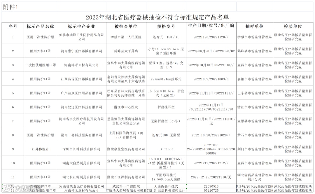三、对上述抽检中发现的不符合标准规定的医疗器械产品,湖北省药品监督管理局已要求被抽检单位所在地药品监督管理部门按照《医疗器械监督管理条例》等法规规章要求,对相关单位进行调查处理,督促企业查明原因、制定整改措施并限期整改。对已上市的不合格产品采取相应的召回纠正措施,确保产品的质量安全有效。涉及外省企业的,已通报当地药品监管部门。