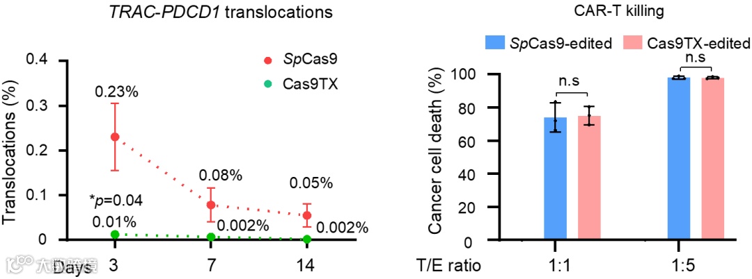 在经历了上述从发现异常到找到原理以及解决方案之后,研究团队进一步将Cas9TX应用于新一代CAR-T细胞的制作中,发现在不影响CAR-T杀伤效率的同时,Cas9TX将靶向位点之间的染色体易位降低到了背景水平。