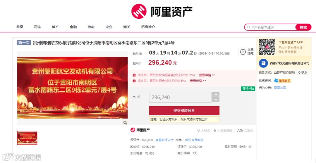 该标的将于2014年10月31日10时起在阿里资产平台进行公开竞价活动,该标的位于贵州省贵阳市南明区富水南路东二区9栋2单元6层4号,建筑面积为64.27平方米。