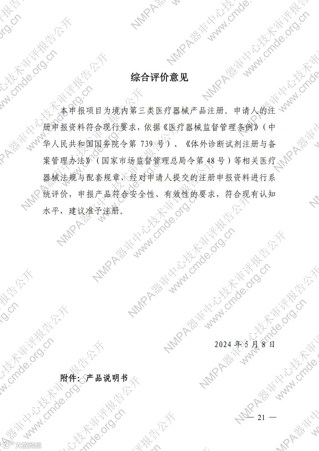 7月9日,器审中心发布了1则三类医疗器械产品与1则体外诊断试剂产品的审评报告,详情如下: