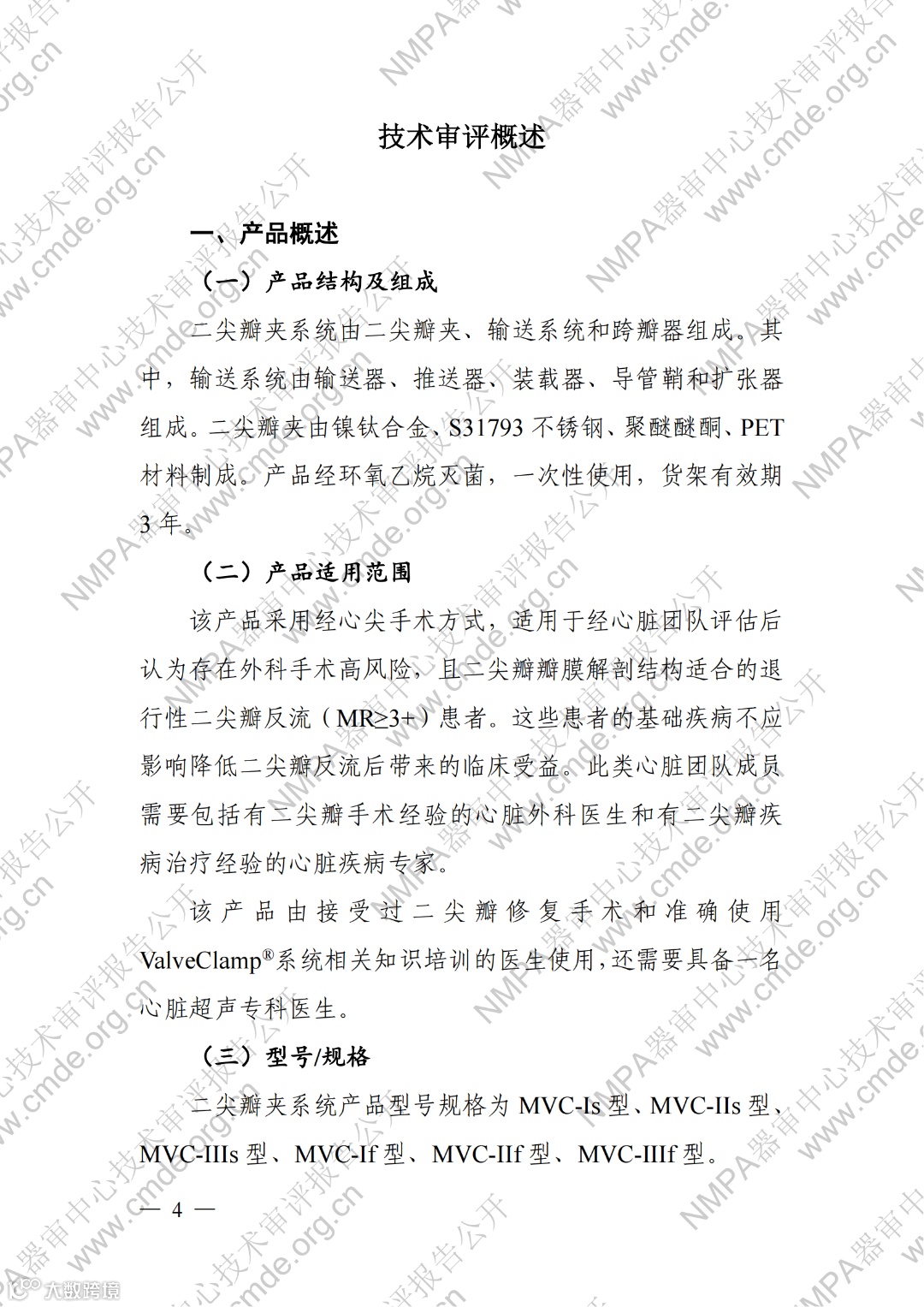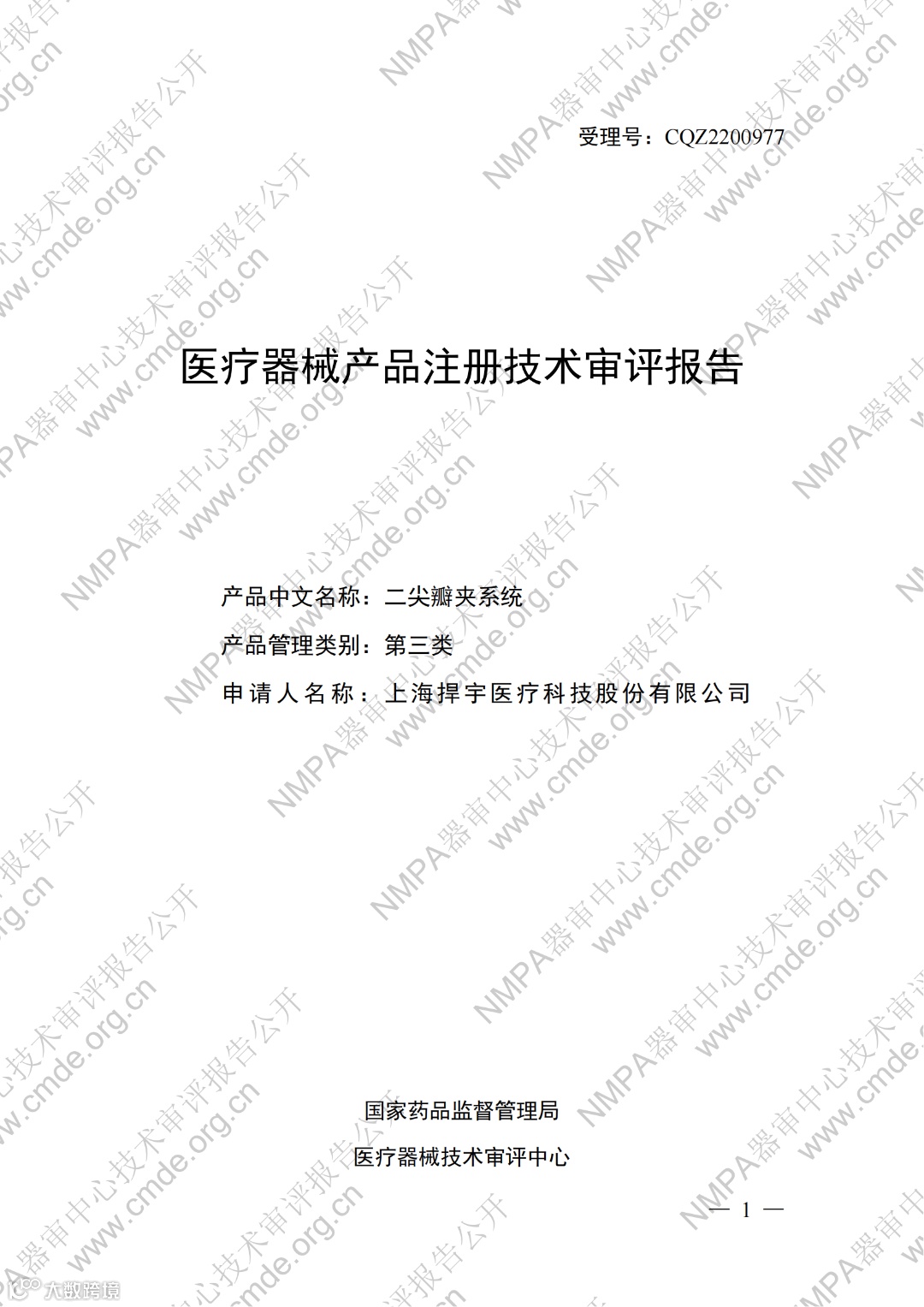 9月12日,器审中心公开了由上海捍宇医疗科技股份有限公司生产的Ⅲ类医疗器械产品“二尖瓣夹系统”的审评报告,详情如下: