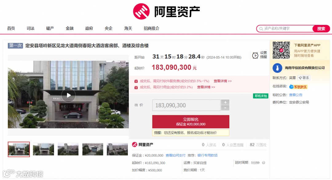 其中位于定安县塔岭新区见龙大道南侧春阳大酒店客房部、酒楼及综合楼将于5月14日上午10时至5月15日上午10时拍卖,评估价为183090300元,以评估价起拍,参拍需缴纳竞买保证金2千万元,增价幅度为50万元或其整数倍。