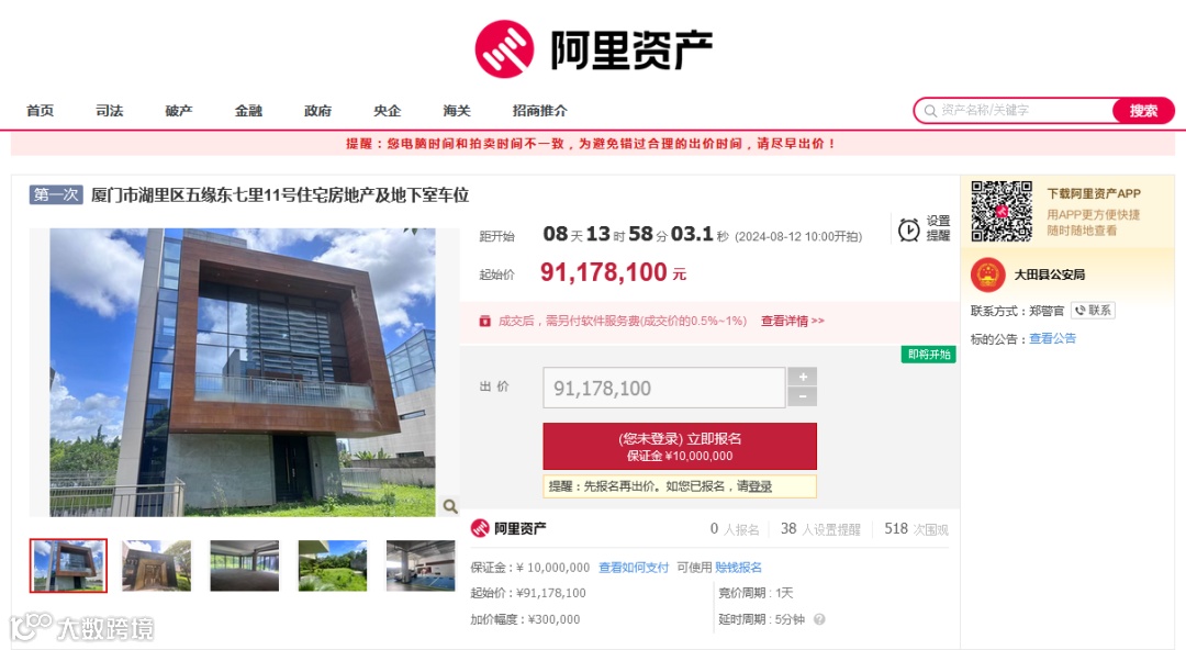 2024年8月12日10时至2024年8月13日10时(延时除外),名为厦门市湖里区五缘东七里11号住宅房地产及地下室车位的标的将在大田县公安局淘宝网资产拍卖网络平台进行公开拍卖活动。