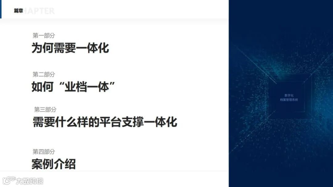 前端业务系统五花八门,档案系统作为文件生命周期管理的最后一公里,承担着与前端系统对接的重任,这正是档案系统的源头,也是难点所在,本课程给大家带来了业务与档案一体化管理的创新思路。课程内容主要包括“为什么需要一体化”、“如何进行一体化管理”、“需要什么样的平台支撑一体化?”以及案例介绍四部分。