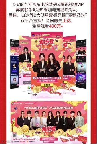 同时,6月18日当天,京东计算机数码&腾讯视频VIP再度联手#为热爱加电宠鹅派对#,孟佳、白冰等9大明星震撼亮相“宠鹅派对”双平台直播!也取得了全网曝光上亿,全网观看400万+的战绩。