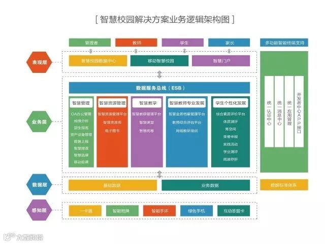 智慧校园整体设计采用弹性构架,所谓弹性架构是将所有的硬件设施集中起来,根据各系统的忙闲情况,动态分配(最下层);统一管理服务、安全服务、标准、规范和扩展接口(左右两侧);统一数据管理,建立统一的数据规范(基础软件服务层);统一展现层。