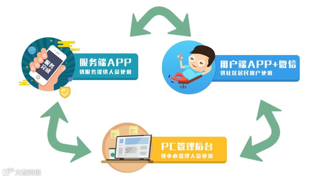 社区服务中心、居民以及服务者三方角色将原有的传统线下行业中大量的人力劳动转为线上高效的多终端处理。