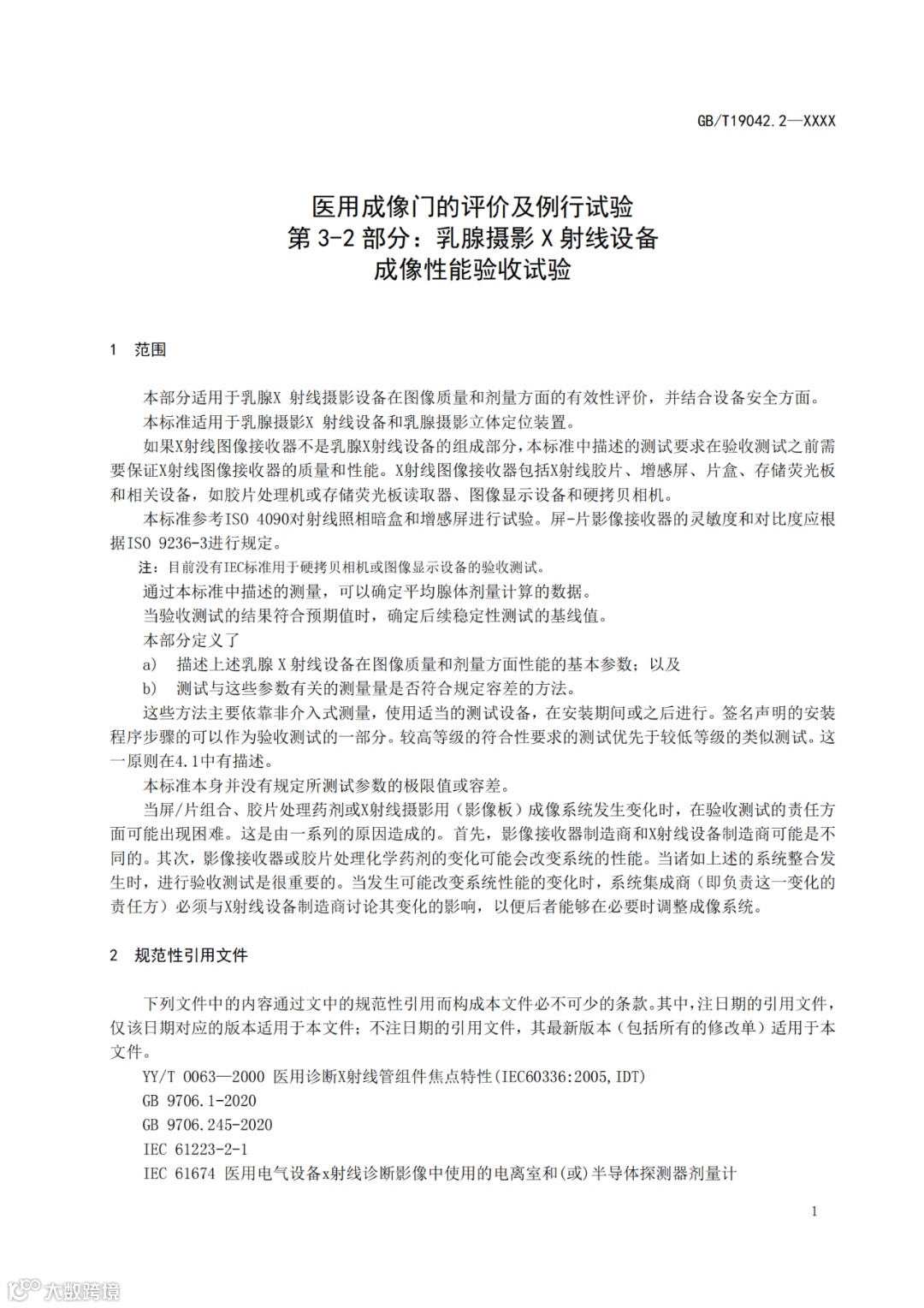 为进一步做好国家标准立项工作,使我国医用X射线标准与国际标准同步转化,根据《医疗器械标准制修订工作管理规范》的要求以及医用电器标准化技术委员会医用X射线设备及用具分技术委员会2023年项目征集情况,现对GB/T19042.2《医用成像部门的评价及例行试验 第3-2部分:乳腺摄影X射线设备 成像性能验收试验》等2项推荐性国家标准立项项目公开征求意见。