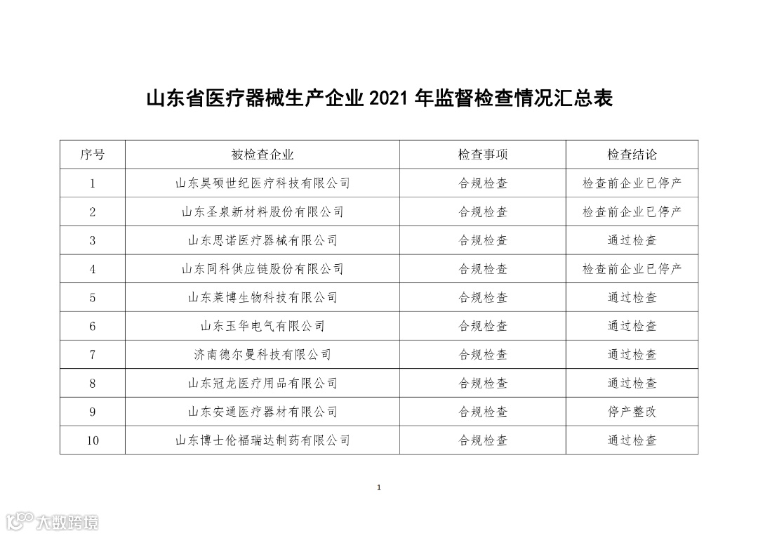 为加强山东省医疗器械生产企业监管,保障医疗器械生产环节质量安全,2021年山东省药品监督管理局对全省139家重点监管医疗器械生产企业开展了合规检查,对14家医疗器械生产企业开展了飞行检查,检查结果详情如下:
