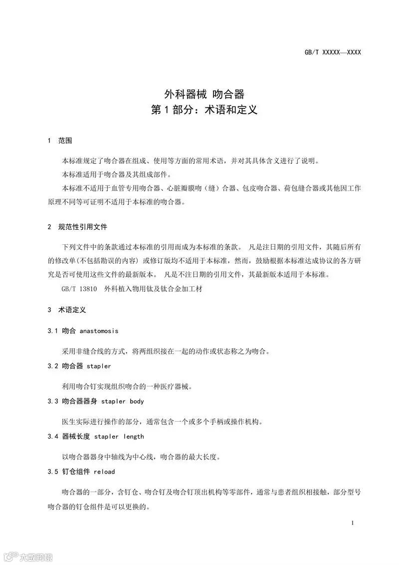 为进一步作好国家标准立项工作,根据《医疗器械标准制修订工作管理规范要求》,全国外科器械标准化技术委员会(SAC/TC94)对医疗器械标准立项项目展开了征集、遴选工作。在结合监管和产业需求,充分论证、广泛听取各方面意见的基础上,计划申报国标《外科器械 吻合器 第1部分:术语和定义》、《外科器械 吻合器 第2部分:通用要求》,并公开征求意见。