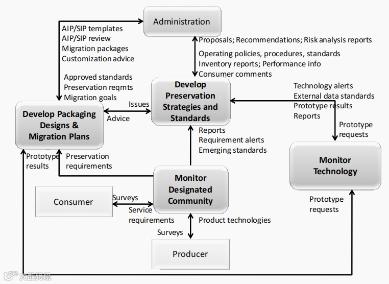 OAIS功能中的“保存规划”(Preservation Planning)功能实体负责监控OAIS环境并提供建议和保存计划,以确保OAIS中存储的信息长期可被指定社区访问、理解和充分使用。
