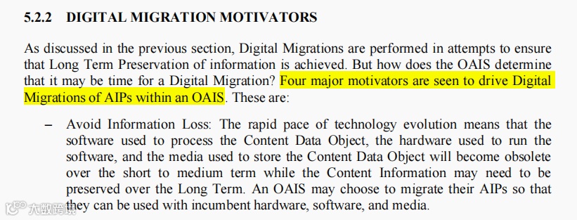 主要考虑存储成本、用户需求以及存储介质寿命等因素对长期保存的影响,分析OAIS在这三种情况下应进行AIP迁移活动。2025版则将在此基础上又新增了一条:“避免信息丢失:技术发展的快速迭代意味着用于处理内容数据对象的软件、运行该软件的硬件以及存储内容数据对象的介质将在短期至中期内变得过时,而内容信息则需要在更长周期中得到良好保存。OAIS可以选择迁移AIP,以便它们能够与现有的硬件、软件和介质兼容。”