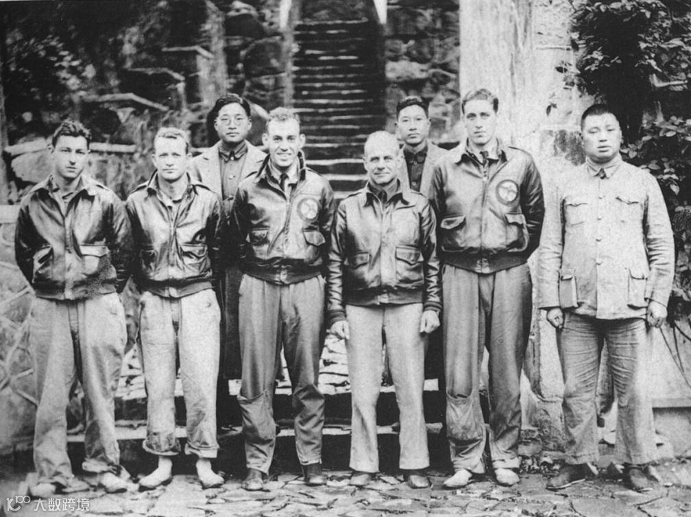 1942年4月,获救的一号轰炸机机组人员与救助的中国军民在临安天目山合影,前排左四为空袭东京指挥官杜立特中校