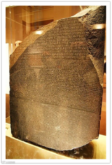 罗塞塔石碑是大英博物馆的镇馆之宝,距今已有2200多年的历史,1799年在埃及港湾城市罗塞塔被发现。石碑上用古埃及象形文字、古埃及世俗体文字和古希腊文字刻了同样的托勒密五世诏书内容,这使得近代的考古学家得以有机会解读出已经失传千余年的古埃及象形文字的含义,成为开启古埃及五千年文明的一把钥匙。