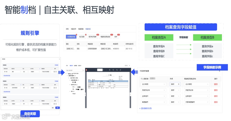 为此,A公司实施电子会计档案单套管理改造工程,系统梳理报销、应付、应收等七大核心业务的全流程节点,精准界定各环节所需归档会计资料。通过 API 接口与数据库直连技术,实现与前端4个业务系统的数据实时交互,构建自动化数据采集与归集体系。基于业务逻辑与法规要求,明确档案证据链关联规则,通过搭建凭证组装关联引擎,完成凭证间的自主关联匹配,完整还原每笔业务的证据溯源链条。