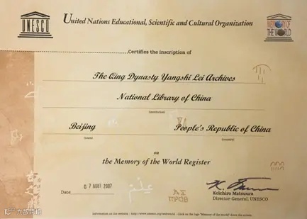 清代“样式雷”建筑图档《世界记忆名录》证书
