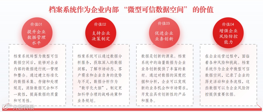 在数字经济蓬勃发展的时代,数据成为驱动企业创新与发展的核心要素。企业内部各类系统未能做到真正的数据贯通,在系统运转过程中,总有数据标准不统一导致格式混乱、各系统间数据接口不兼容造成对接困难、数据存在孤岛现象无法有效共享、数据质量参差不齐影响使用价值,以及数据安全防护薄弱面临泄露风险等问题,档案系统凭借其可信与数据收集等独特的功能与属性,正逐渐转型为企业内部的 “微型可信数据空间”。通过重塑档案系统的定位,为企业挖掘数据价值、提升核心竞争力开辟了新路径。