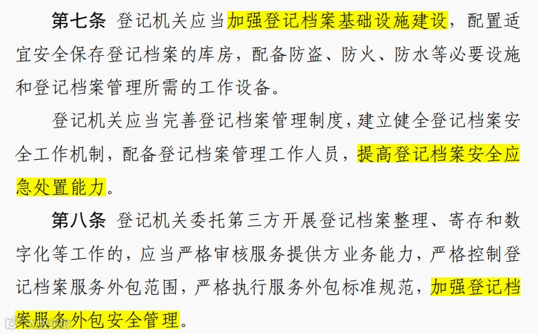 《办法》第七、八条对登记机关的基础设施建设、工作机制以及档案服务外包都提出了相应安全管理要求。