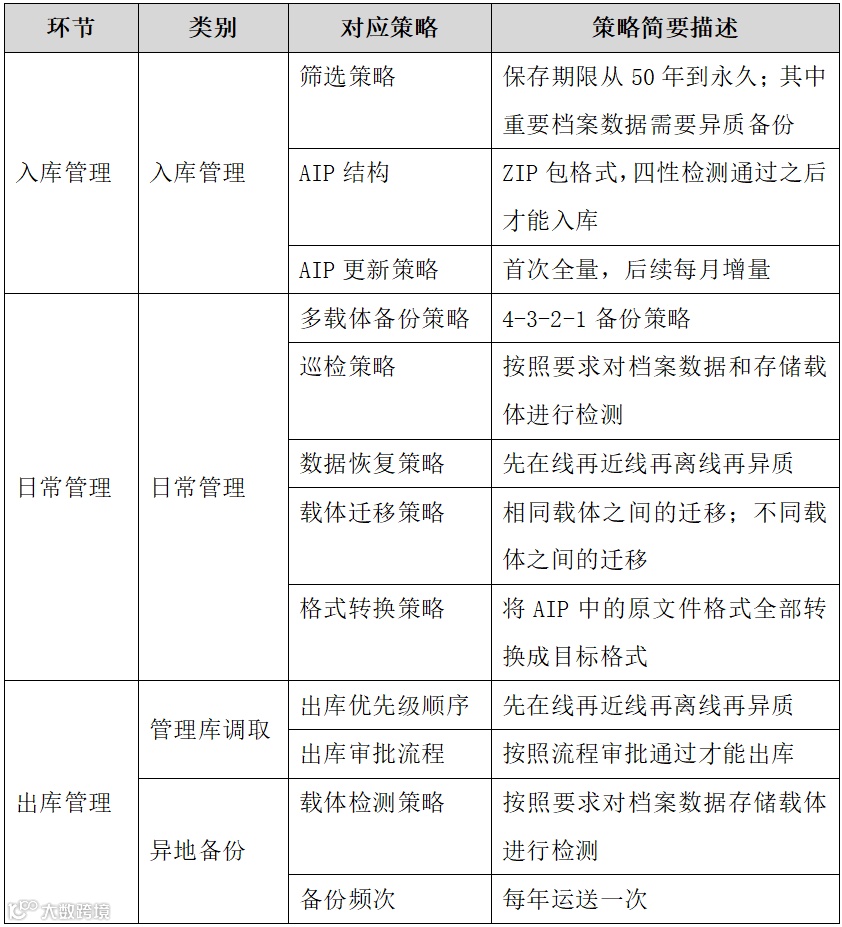 档案数据长期保存策略如下表汇总所示: