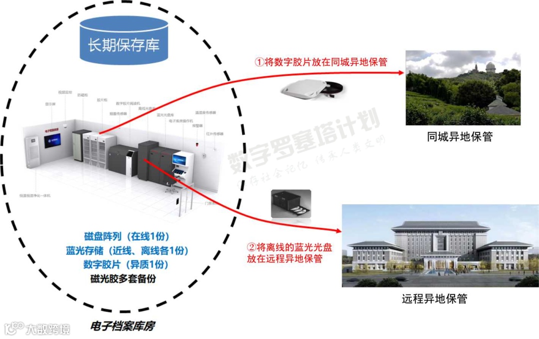 由于长期保存库采用了4-3-2-1的备份策略,在执行异地备份时不需要再进行额外的数据备份,只需要将其中1份离线的蓝光光盘出库(以盘匣方式出库,便于保存)之后异地保管在远程异地的档案馆库房即可;另外,可以考虑在同城异地建设数字胶片库房,将重要档案数据的1份异质备份(胶片装盒)妥善保管在同城异地库房中。