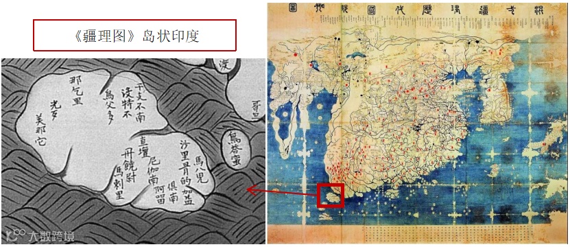 至于其原因,有研究者分析可能是由于制图者对印度洋还只有很不充分的知识,无法确定李泽民《声教广被图》上的岛屿状印度是否画错了位置。所以他没有贸然将岛上地名归并到新增的半岛上去,而宁可保留着《声教广被图》上那个岛屿状印度,只是设法避免两处地名发生重复而已。