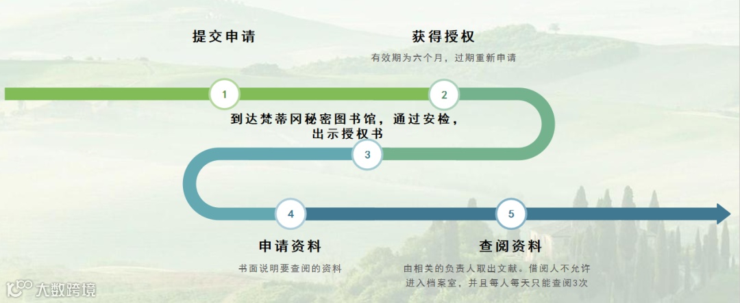 梵蒂冈秘密档案馆每周一至周五上午开放,需提前预约。借阅文献时需出示身份证件和授权书,填写申请表格,说明拟查阅的资料。之后由负责人取出文献,研究者只能在阅读室中阅览,禁止拍照、复制或携带资料离场,每人每天仅允许查阅3次。