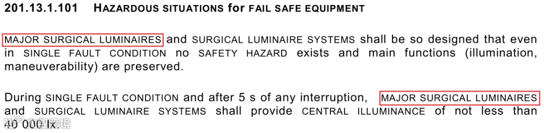 2)“在单一故障状态下和任何原因的断电5s后,不防故障手术无影灯和手术无影灯系统应能提供不低于40000lx的中心照度。”