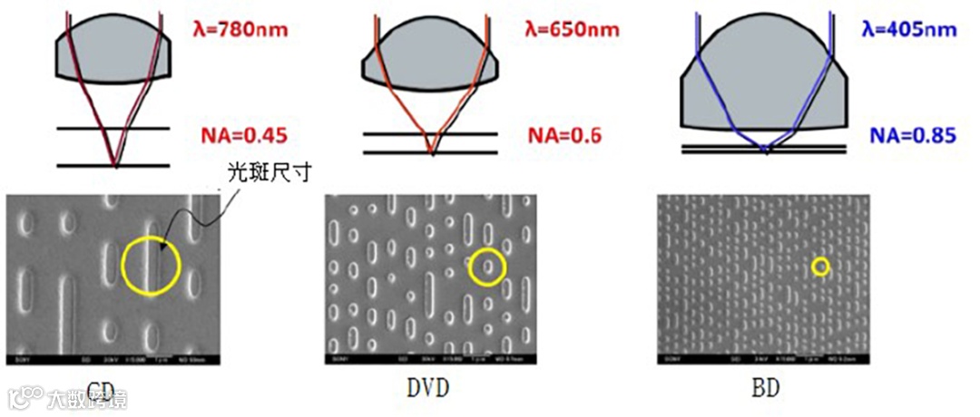 2002年蓝光光盘面世,采用蓝紫色激光。波长缩短到405nm,激光通道的数值孔径N.A.提高到0.85(无量纲的数,衡量能够收集的光的角度范围)。容量:25GB、50GB、100GB、128GB、200GB。