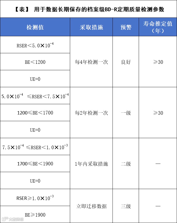 长期质量检测是光盘保存期间,对记录在光盘中数据质量的定期检测。定期质量检测参数如下表所示: