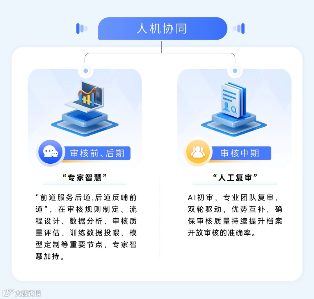 充分发挥“人工智能+人类智慧”双脑引擎的优势,打造开放审核“最强大脑”。通过“AI初审+人工复审”方式,实现人机协同、双轮驱动,撬动档案开放审核工作改革,引领档案开放审核结果走向客观、准确。
