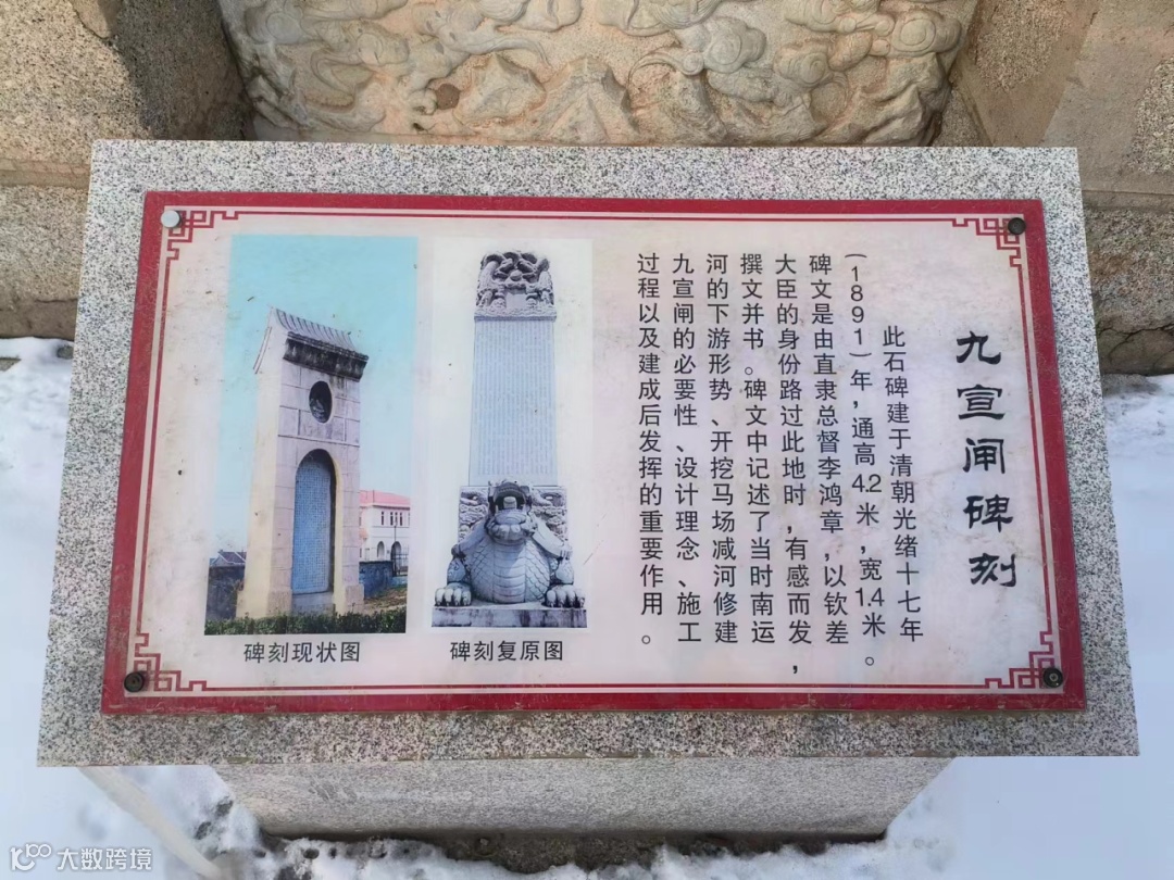 九宣闸就建于1881年,距今经过多次改造,是天津水利史上较早建筑的水闸,除闸门和启闭设备进行了更新换代,其它仍为原建筑物,且还在使用。老闸门,老砖块,李鸿章记载的老记事碑座落在旁边的南运河文化园,新的闸门耸立在其前方。该闸在中国近代水利科学技术水平方面具有典型的代表性,不仅是一座重要的水利工程建筑,而且还饱含历史文物价值。