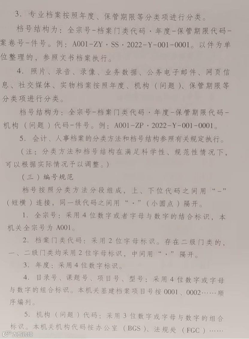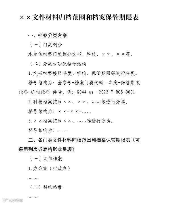 《通知》按照《归档文件整理规则》《机关档案管理规定》和各门类档案标准规范编制,以样例方式(简单示例如下图所示)对于不同门类档案的分类方法、编号要求以及文件材料归档范围和档案保管期限表等作了原则性、示范性规定,引导各地区各部门尽量统一档案资源分类、整理、编号要求,以便于档案资源科学整理和统一管理,从根本上提升档案资源质量和管理水平。