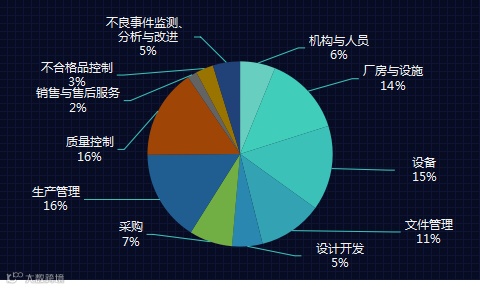 在41家企业数据中共有358条缺陷项,如下图可知,缺陷项主要集中在厂房设施、设备、生产管理及质量控制。