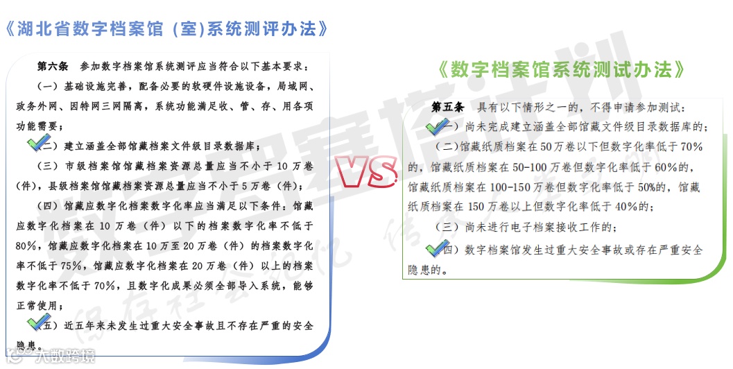 关于参与数字档案室系统测评的要求,两者在描述上也是不同的,《湖北省数字档案馆 (室)系统测评办法》列举了参加数字档案馆系统测评的4条基本要求;而《数字档案馆系统测试办法》则明确了4个不得申请参加评价的情形。两者都要求已开展电子文件归档工作、按规定向本地区国家综合档案馆移交档案、未发生过重大信息安全事故或不存在严重信息安全隐患,在此基础上,湖北省局版进一步明确了时间要求。另外,湖北省局版还要求“数字档案室系统应当与办公自动化系统、业务系统等相互衔接”。特别需要说明的是,湖北省不实行试点单位制,只要数字档案室自评分数达到75分以上,便可向省档案馆提出测评申请,因此没有国家局版“未纳入数字档案室建设试点单位名单不得申请参加数字档案室评价”的要求。