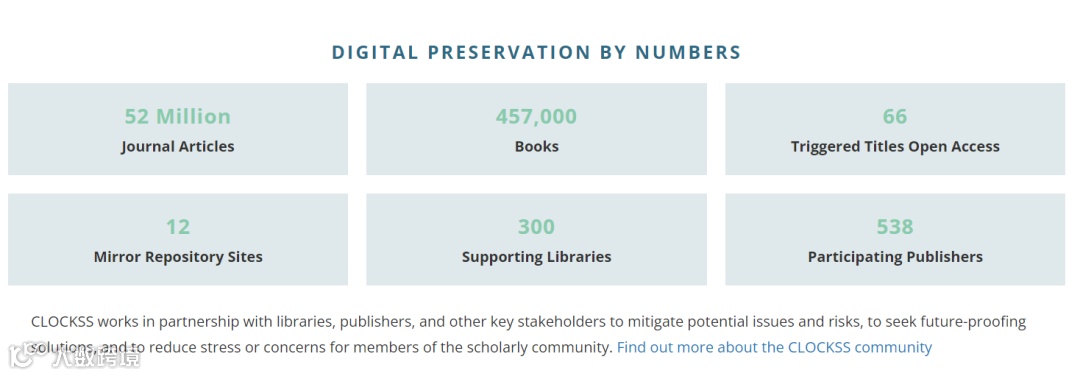 自2006年以来,世界顶尖的学术出版商和科研图书馆共同参与管理了一项非营利性项目——一个全球的隐性存档(Dark Archive)系统——CLOCKSS,致力于建立可持续的、全球分布式的存档系统,确保基于网络的学术资源的长期保存,无限期地保存学术作者的遗产。CLOCKSS是图书馆领域LOCKSS项目关于存档资源在存储、利用等方面进一步的延伸。