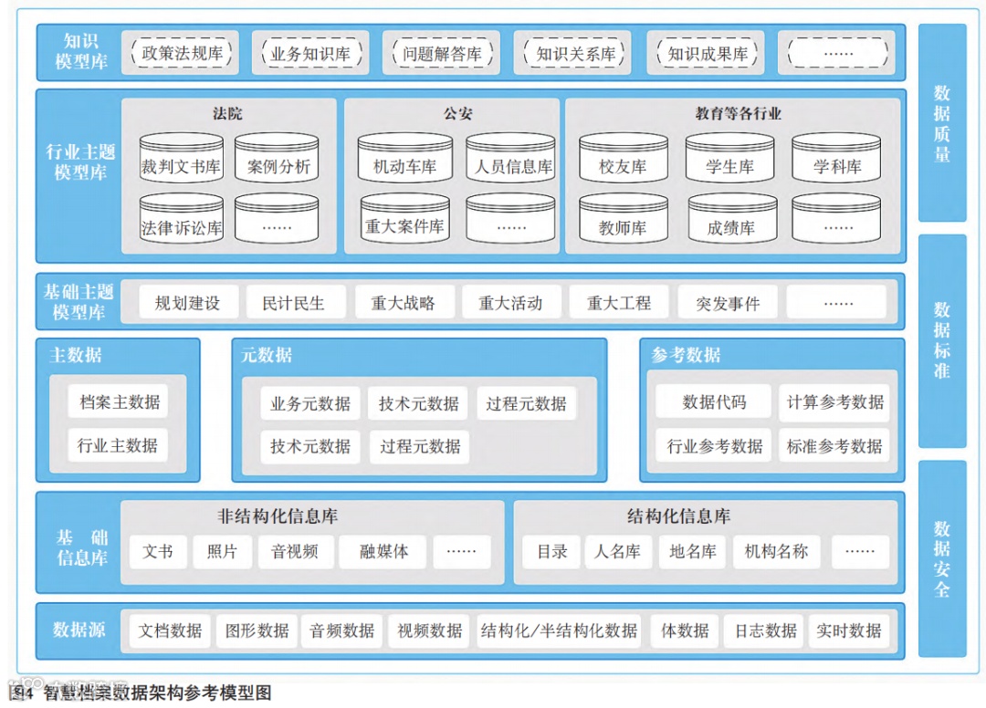 智慧档案数据架构主要由数据源、基础信息库、主数据、数据模型和数据质量、数据标准、数据安全管理组成。