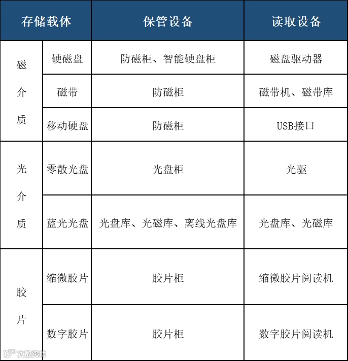 电子档案库房中,各类存储载体与保管设备、读取设备之间的关系如下表所示(注:由于电存储介质在长期保存过程中存在因为存储单元内的电子逃逸而导致数据永久性丢失风险,目前在档案数字资源长期保存领域基本没有应用,因此电子档案库房中暂时不考虑电存储介质):