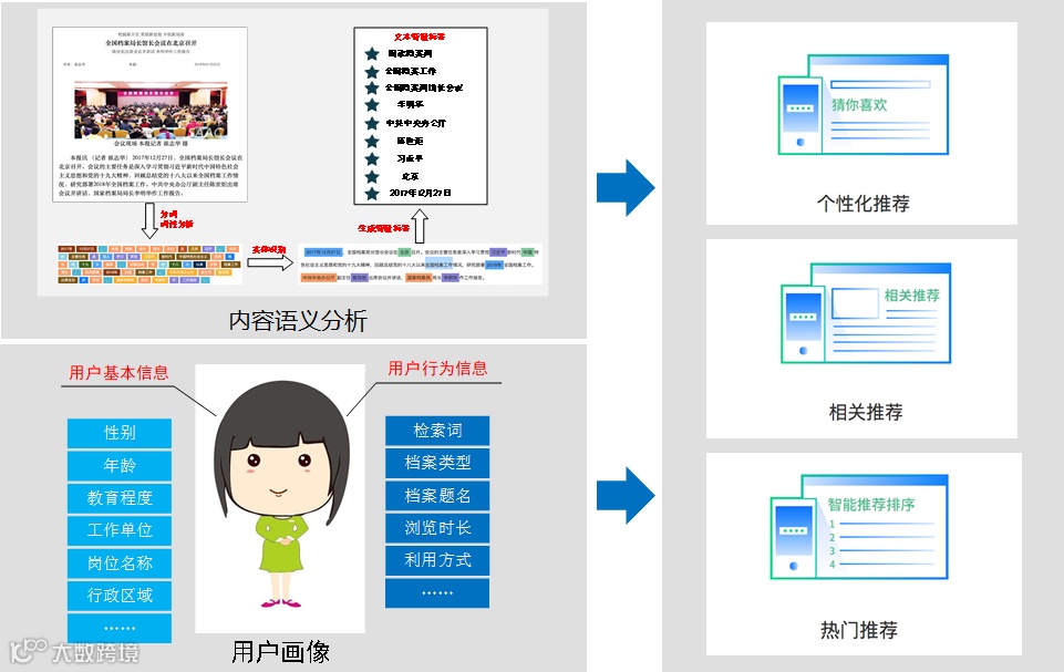 然后根据利用者的基本信息和行为信息,借助AI决策模型智能抽取用户可能感兴趣的档案信息推送给他,包括个性化推荐、相关推荐、热门推荐等。同时,AI引擎还可以在用户的后续操作中进一步学习用户的行为习惯,不断优化和改进决策模型,提升自身的“智慧”程度。