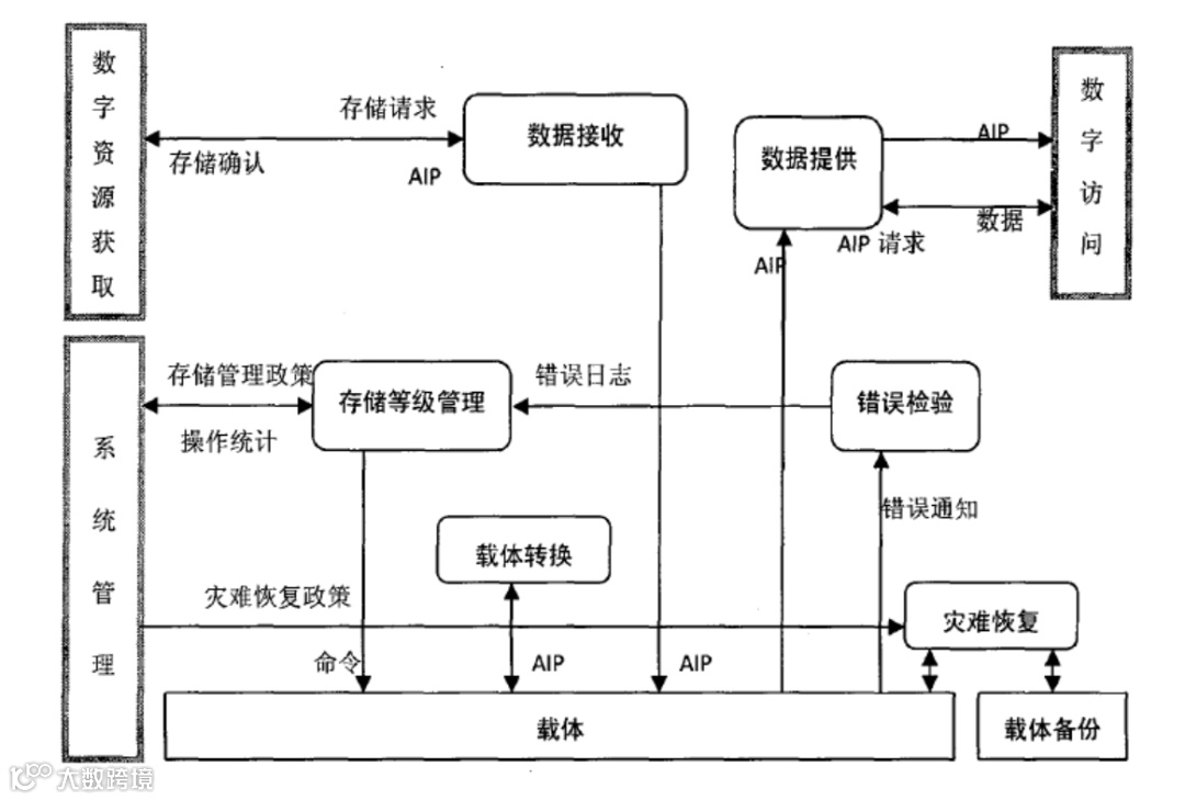 在OAIS参考模型中定义了六大功能实体和三大信息包。下图描述了OAIS参考模型的框架结构(以档案数字资源管理为例):
