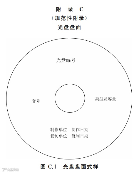 DA/T 52-2014《档案数字化光盘标识规范》附录A和附录C中给出了光盘标签的样式和盘面打印的样式: