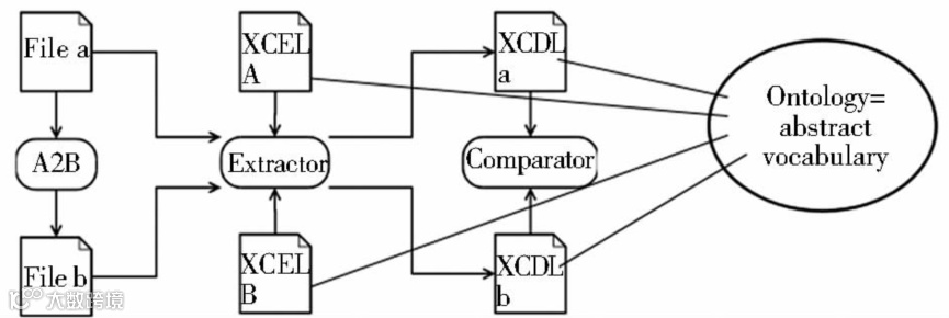 从数字对象提取描述信息是有用的,但还不够。不仅每个文件格式的编码信息不同,而且它们的属性意义之间还存在很大差异。例如,一种格式可用像素表示图像宽度,而另一种格式可以使用米来进行度量。为了跨文件格式比较特征,UzK提出了XCL本体(XCLOntology)的概念,其定义了文件格式属性以及它们之间的关系。XCL本体通过关联文件格式属性到一组基本信息的方式实现不同格式文件之间的比较。XCL语言所有组件之间的关系如下图所示: