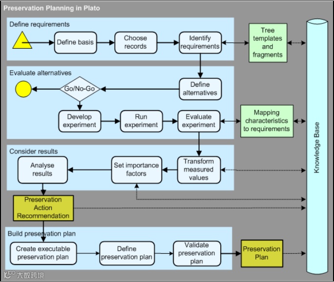 PLANETS提供Plato工具用于执行保存计划,Plato工具由项目成员维也纳技术大学开发,是基于Web的判决支持工具,其通过严格体系化的过程来定义和优化保存需求,比较可用的保存策略和行为,并从众多保存策略中辨别出最佳策略,帮助用户生成和评价保存计划并定义保存行为。Plato工具定义了包括定义需求、评价备选方案、结果分析和建立保存计划4个部分的保存计划工作流,如下图所示: